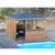 Pool house fabriqué en sapin traité très haute température à 215°C sans aucun ajout de produit de synthèse Dimensions hors tout 3.79 x 3.79 m Hauteur de passage : 215 cm / hauteur totale : 283,9 cm Dimensions extérieures au sol 3.49 x 3.53 m Surface extérieure 14,36 m2 Livré avec 4 poteaux 14x12 cm * 1 paroi avec lambris en bois thermo chauffé * 1 paroi avec ventelles mobiles et orientables en bois thermo chauffé * 2 parois avec comptoir largeur 400 mm longueur 2 140 mm hauteur 1 135 mm en bois thermo chauffé et lambris en bois thermo chauffé en partie basse. Passage libre dans la paroi largeur 103 cm hauteur 215 cm. Couverture en panneau ACP épaisseur 3 mm 2 faces alu et milieu composite PP polypropylène couleur foncé Fabriqué en France * Garantie : structure 10 ans contre l'attaque d'insectes et le pourrissement couverture 2 ans Produit PEFC A monter soi-même