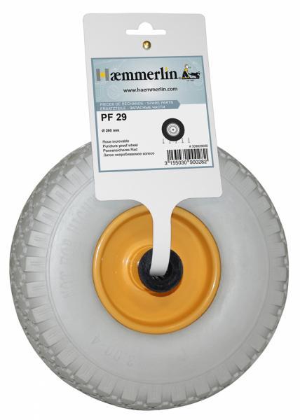 Roue increvable de rechange Ø 260 mm, jante métal flasque.Moyeu Ø 20 mm, longueur 75 mmPoids : 2,5 kgCompatible avec les diables : Haemmerlin 924 G, 924 P, Rollax® 946 G, Rollax® 950 G, les dévidoirs Haemmerlin, les chariots Big Garden, Circus Garden, les brouettes Roller (roulette).