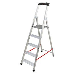 Avantages et points forts de l'escabeau 5 marches Alu Pro PolyvalenceL'escabeau Hailo Alu Pro 5 marches dispose d'une grande tablette porte-outils avec crochet porte-seau et logement de visseuse pour un confort de travail inégalé.