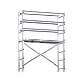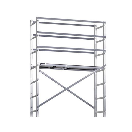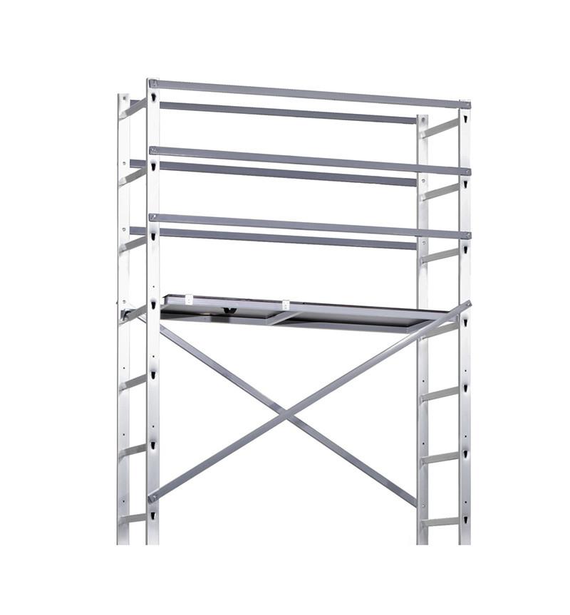 Ce pack contient 2 échelles de 8 échelons, 4 manchons de liaison, 5 lisses garde-corps, 4 diagonales, 1 plateforme, 4 jambes de force, 2 roues de déplacement et un kit de visserie.