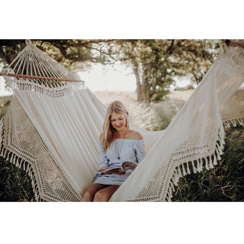 Laissez-vous allez à la détente grâce au hamac Palacio Natura. Avec une grande surface de couchage : 260 x 160 cm, vous aurez l'espace nécessaire pour être confortablement installé puisqu'il est aussi grand qu'un lit! De plus, ses baguettes d'écartement en bois garantissent un bel aspect et une stabilité optimale puisqu'elles sont conçues dans ce qui se fait de mieux en bois dur du Brésil. Son tissu 100% coton recyclé 450g/m² est aussi résistant qu'agréable. Ce hamac artisanal est orné de bordures décoratives macramées suspendues sous le produit, et tient par des cordes épaisses tissées à la main.