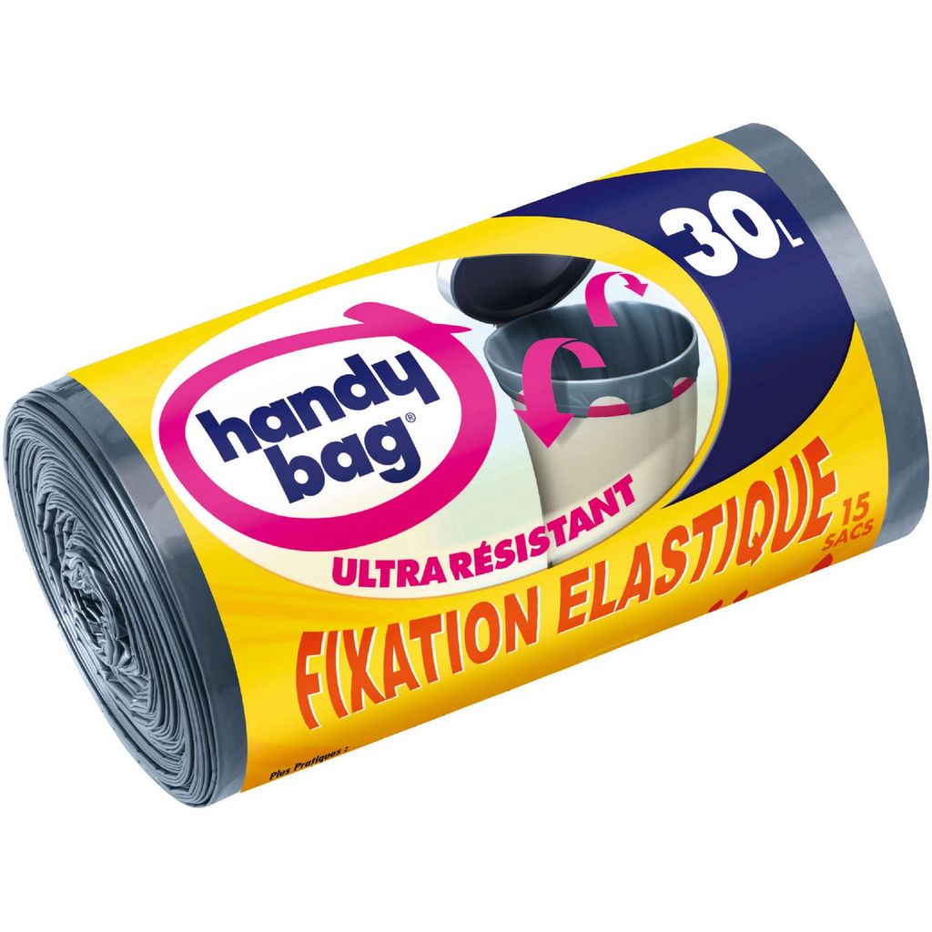 Poignées coulissantes faciles à fermer et à transporter - Système de fixation élastique qui se fixe à la poubelle - Plastique ultra-résistant grâce à la triple épaisseur - Étanchéité maximale grâce au fond anti-fuites HANDY BAG sacs poubelle FIXATION ELASTIQUE à poignées coulissantes 30L