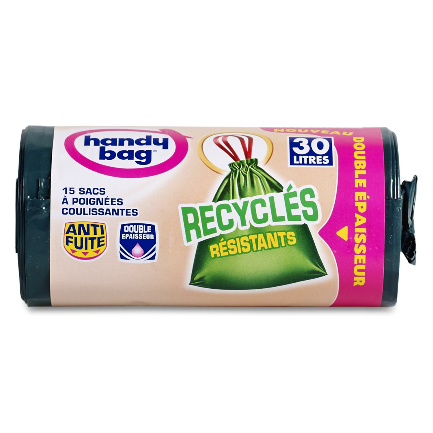 HANDY BAG sacs poubelle RECYCLES à poignées coulissantes 30 L Sacs poubelle à poignées coulissantes faciles à fermer et à transporter - Sacs fabriqués à partir de 90% de plastique recyclés - Plastique résistant grâce à sa double épaisseur - Etanchéité maximale grâce au fond anti-fuites.