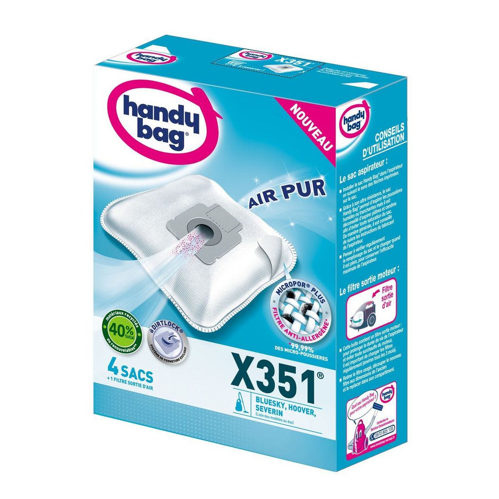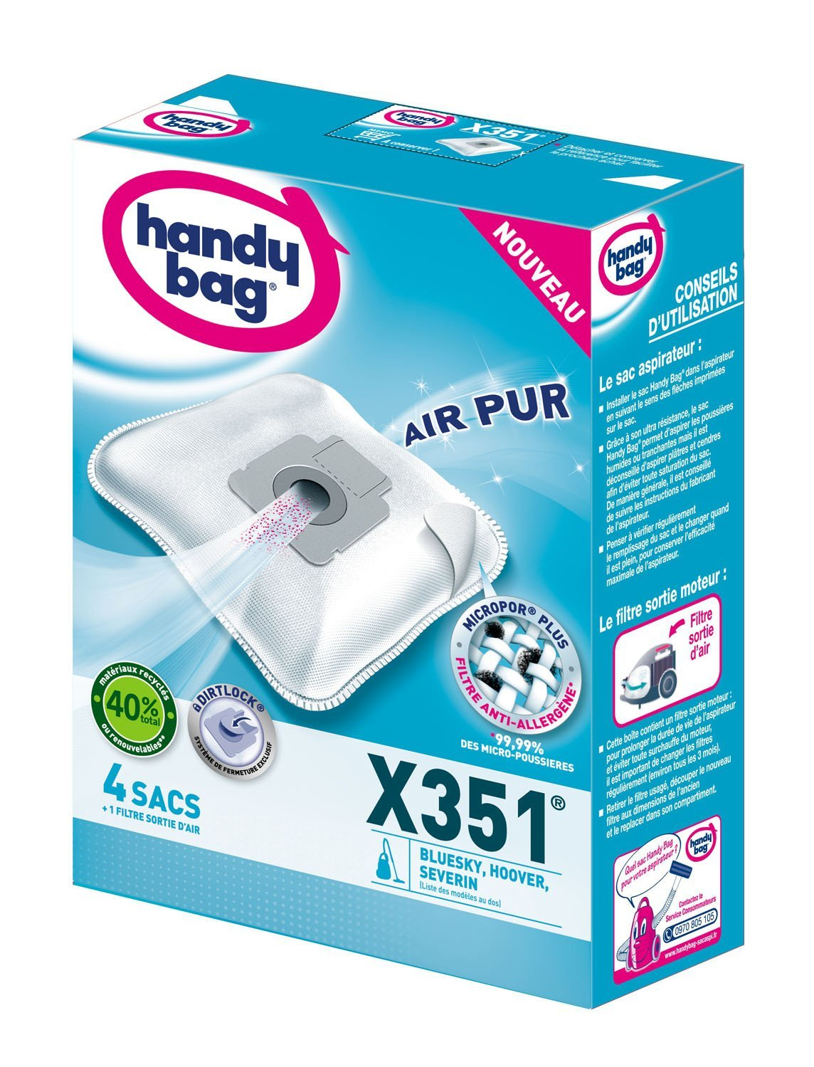 Les sacs aspirateurs Handy Bag X351 sont spécialement conçus pour s'adapter parfaitement aux modèles Bluesky, Hoover et Severin. Ce lot de 4 sacs inclut un filtre de sortie d'air à découper sur mesure, garantissant une compatibilité optimale avec votre appareil.
