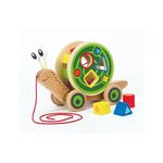 Escargot en bois à tirer avec jeu de formes à incruster dans la coquille. Le rond boite à forme se détache pour encore plus de jeu partout. Dès 12 mois.