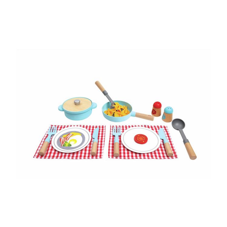 Avec la marmite en bois, la poêle en bois, les assiettes en bois et les accessoires du set de cuisine et de service, votre enfant a tout ce dont il a besoin pour cuisiner un délicieux repas entre amis ou en famille !