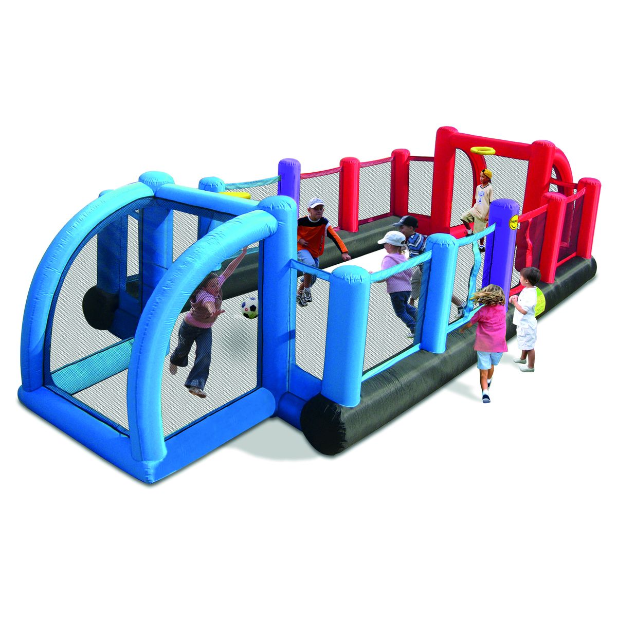 Découvre le terrain de sport Happy Hop. Tu pourras t'amuser pendant des heures grâce à ses différents éléments : terrain de foot gonflable, buts intégrés, sac de rangement et kit de réparation fournis. Dix joueurs peuvent jouer en simultanés. L'installation est très rapide grâce au souffleur permanent. La sécurité est assurée grâce au système d'encrage au sol.