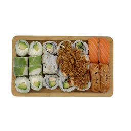 Ingrédients : Riz préparé (eau, riz, vinaigre de céréales (vinaigre d'alcool (alcool, BLÉ (GLUTEN), lies de saké, riz, maïs), sel), sucre, sel, mirin (sirop de maïs, eau, vinaigre d'alcool, extrait de riz fermenté (riz, alcool, sel, régulateur d'acidité E330)), sucre, conservateurs (E211, E202)), huile de tournesol), avocat, SAUMON (POISSON), fromage fouetté (fromage (LAIT), sel), oignon frit (oignon, huiles végétales (colza, palme), farine de BLE (GLUTEN), sel), salade, THON au naturel (THON (POISSON), eau, sel), sauce unagi (sauce SOJA (eau, graines de SOJA, BLÉ (GLUTEN), sel), eau, sirop de maïs, sucre, amidon de maïs, sel, alcool, colorant E150, exhausteur de goût E621), galette de riz (amidon de tapioca, farine de riz, eau, sel), menthe, coriandre, nori (algue séchée), concombre, mayonnaise (huile de colza, eau, jaune d'ŒUF salé (jaune d'ŒUF, sel), vinaigre d'alcool, MOUTARDE (eau, graines de MOUTARDE, vinaigre d'alcool, sel, acidifiant E330, conservateur E224, épices), sirop de glucose-fructose, sel, amidon modifié E1422, stabilisant E415, épaississant E412, colorant E160a), SÉSAME, sauce piment (piment, sucre, ail, sel, eau, acidifiants (E260, E330), exhausteur de gout E261, stabilisant E415, conservateur E202), mélange d'épices (piment rouge, SÉSAME, algues Aonori, écorce de mandarine mikan, poudre de sansho, graines de chanvre, graines de pavot), huile de SÉSAME.