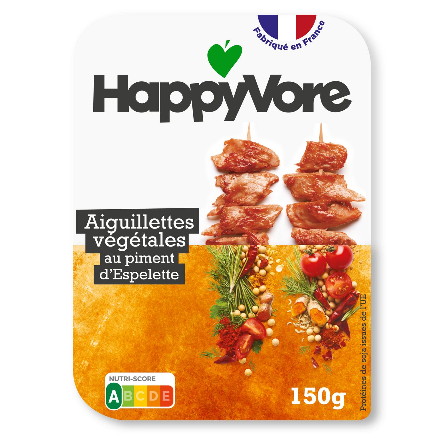 Ingrédients : eau, protéines de SOJA (21%), huile de tournesol, arômes naturels, sel, épices (dont paprika, poivre et coriandre), poudre de tomate, piment d'Espelette A.O.P (0,5%), romarin, agent levant : bicarbonate de sodium, correcteurs d'acidité : vinaigre tamponné et acide citrique