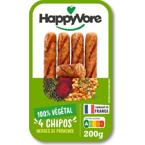 - Les Chipos végétales aux Herbes de Provence HappyVore s'adapteront parfaitement à tous vos plats gourmands du quotidien : en traditionnel saucisse/purée, ou encore accompagnées de pâtes fraîches ou légumes rôtis.