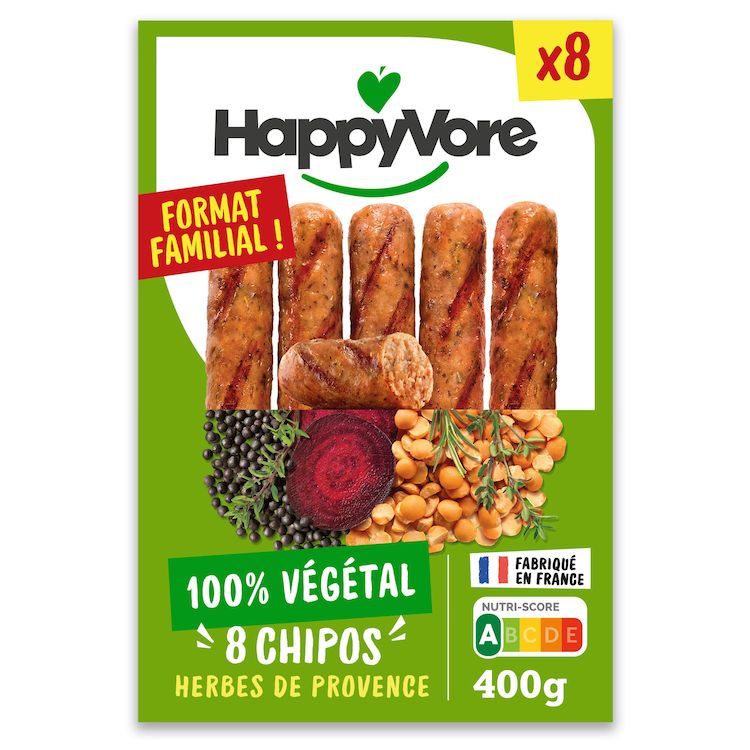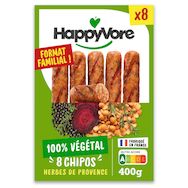 - Les Chipos végétales aux Herbes de Provence HappyVore s'adapteront parfaitement à tous vos plats gourmands du quotidien : en traditionnel saucisse/purée, ou encore accompagnées de pâtes fraîches ou légumes rôtis.