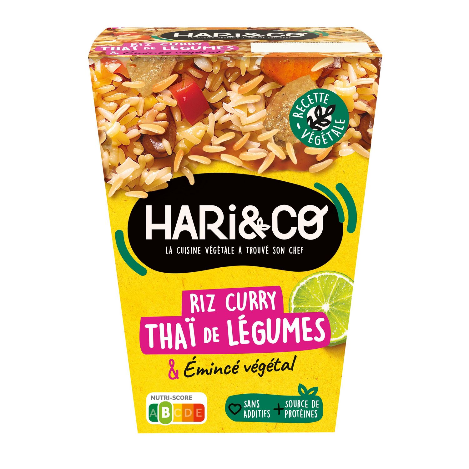 Ingrédients : Riz cuit 38 %, lait de coco 10 % (extrait de noix de coco, eau), eau, champignons noirs 6 %, oignons préfrits (oignons, huile de tournesol), carottes 5 %, poivrons rouges 5 %, protéines de pois et fèves texturées 4 %, sirop d'agave, pulpe de tomates au jus (tomates, jus de tomates), huile de tournesol, jus de citron vert 1 %, purée d'ail, épices 1 %, sauce soja (eau, graines de soja, sel, farine de blé), sel, graines de lin, purée de gingembre, échalotes, amidon de maïs, citronnelle, coriandre, zeste de citron