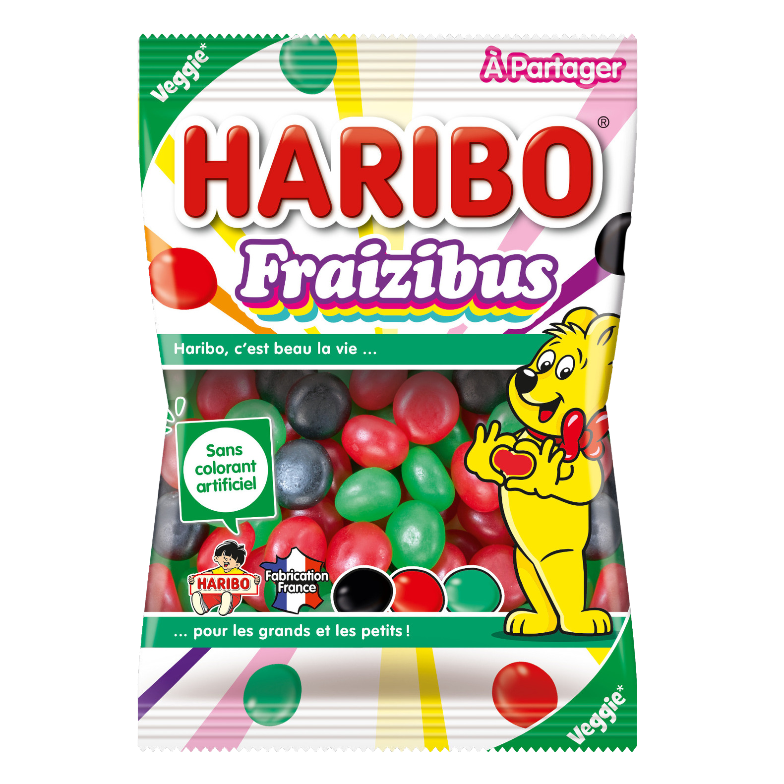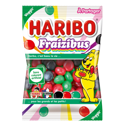 Retrouvez les bonbons cultes de votre enfance HARIBO Fraizibus désormais en sachet à partager. HARIBO Fraizibus sont de savoureuses dragées fondantes aux bons goûts fruités. Ces bonbons sont Veggie (conviennent aussi aux végétariens) et sont sans colorant artificiel.