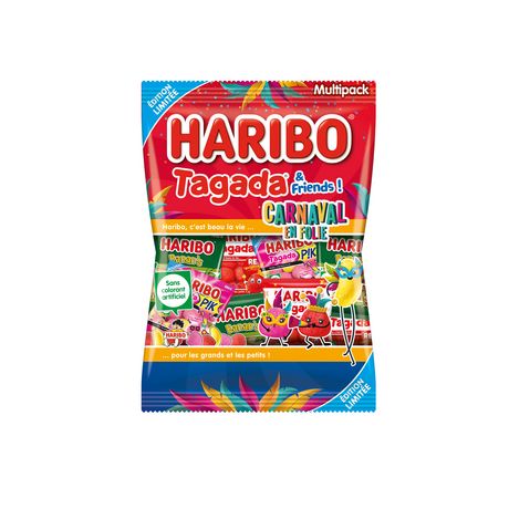 Célébrez le Carnaval avec le multipack HARIBO Tagada & Friends Carnaval en Folie en édition limitée contenant un assortiment de vos HARIBO Tagada et Banan's préférés en format mini sachets. Sans colorant artificiel.