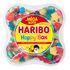 Ingrédients: sirop de glucose; sucre; dextrose; gélatine; amidon; acidifiants: acide citrique, acide malique; arôme; jus de fruits concentrés: pomme, orange, citron, fraise, framboise, ananas; concentrés de fruits et de plantes: carthame, spiruline, pomme, kiwi, baie de sureau, orange, cassis, aronie, citron, raisin, mangue, fruit de la passion, radis; extrait de baie de sureau; sirop de caramel; correcteurs d'acidité: citrate monosodique, malate acide de sodium; colorants: curcumine, charbon végétal, carotènes végétaux, lutéine, anthocyanes; agents d'enrobage: cire d'abeille blanche et jaune, cire de carnauba. Tenir à l'abri de la chaleur et de l'humidité. Peut contenir des traces de blé, lait.