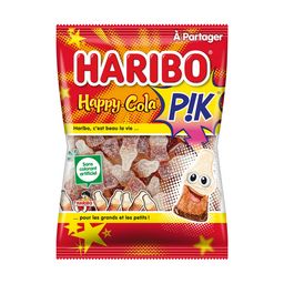 Pour tous les fans du goût cola, retrouvez HARIBO Happy Cola PIK, des bonbons piquants en forme de petites bouteilles au bon goût cola. Ils sont sans colorant artificiel.