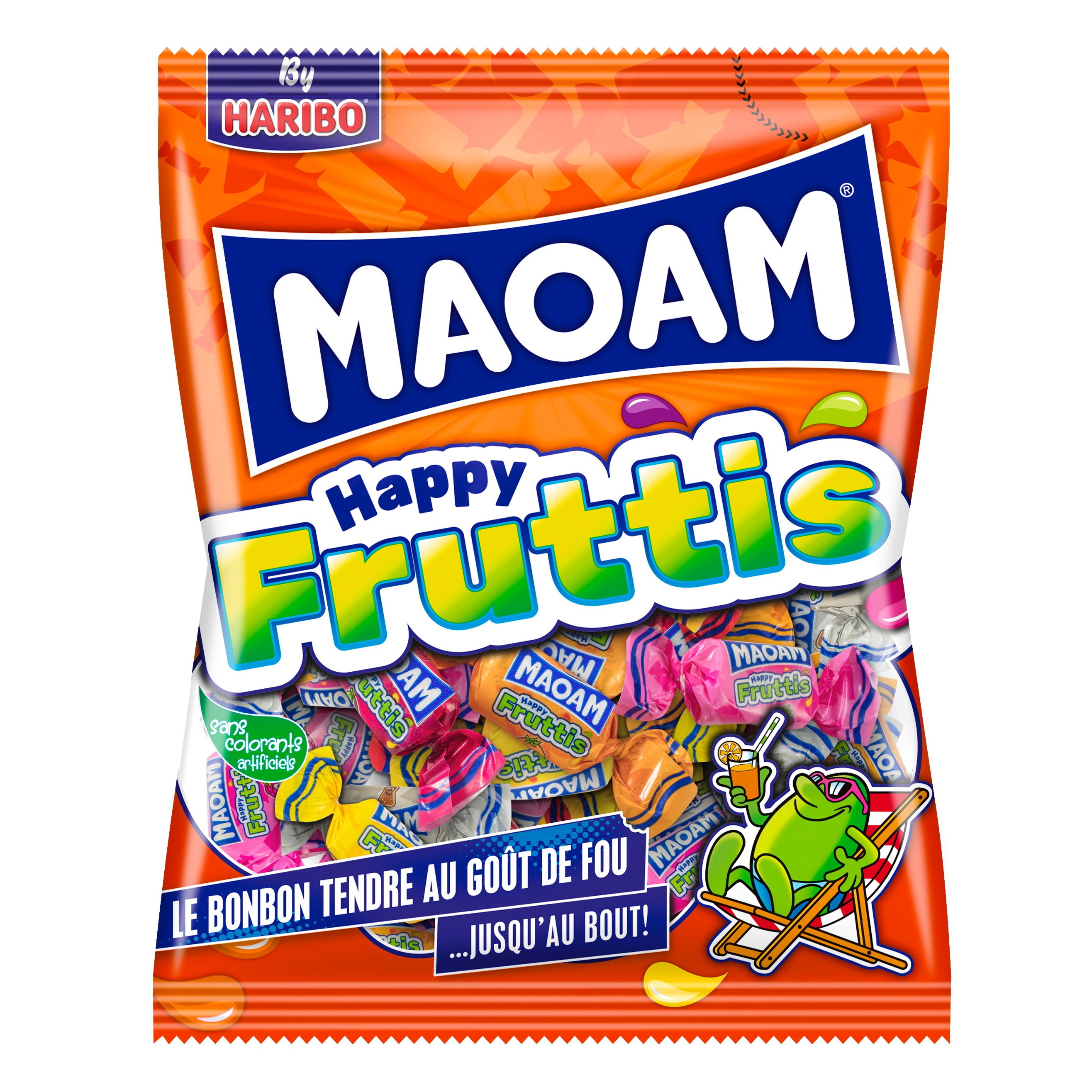 MAOAM Happy Fruttis, le bonbon tendre emballé individuellement. Retrouve dans ce paquet 5 saveurs fraîches et fruitées : fraise, framboise, cerise, orange et citron. Idéal pour les emmener partout avec toi.