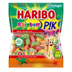 HARIBO Rainbow PIK, ce sont des bonbons piquants en forme de petits tubes colorés aux bon goûts fruités (pomme, fraise, mûre, citron). Un mélange piquant et coloré! Ils sont sans colorant artificiel.
