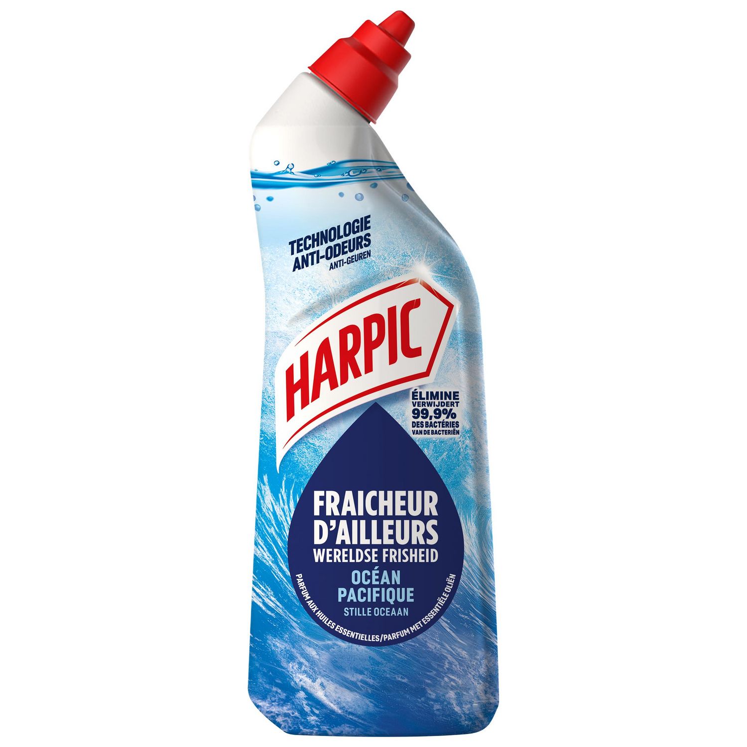 Le nouveau Gel Parfumé Harpic Fraîchur d'Ailleurs Océane Pacifique assure un nettoyage efficace pour vos toilettes. Il élimine 99,9% des bactéries* et empêche l'accumulation des taches et du tartre. Grâce à sa technologie anti-odeurs, sa formule bloque la diffusion des mauvaises odeurs et libère un parfum agréable avec des huiles essentielles, pour garantir une fraîcheur intense et longue durée.
