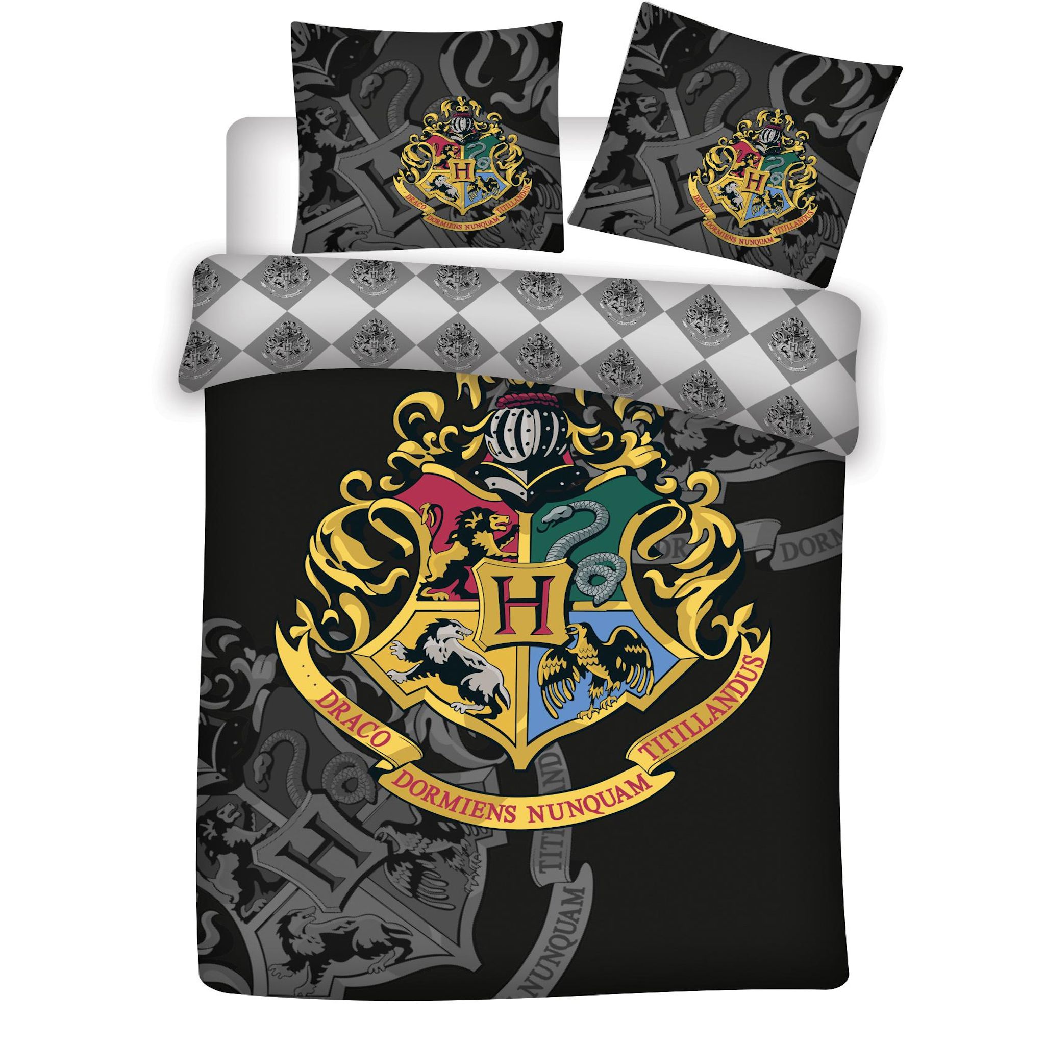 Parure housse de couette enfant en microfibre HARRY POTTER, ornée des 4 maisons de Poudlard pour tous les fans de la saga ! Facile d'entretien.
