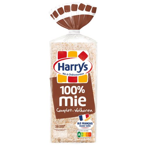 Découvrez 100% Mie Complet : Pour tous ceux qui n'aiment pas la croûte de pain ! Une recette sans croûte, élaborée à partir de farine complète de blé, source de fibres et de sucres lents pour vous procurer l'énergie nécessaire ! Pourquoi c'est bon ? Parce que 100% Mie Complet plaît à tous et allie : • La douceur et le moelleux inimitables de Harrys • La richesse d'un pain de mie aux céréales • Une recette sans huile de palme et bien sûr sans croûte À déguster nature ou toasté pour accompagner un petit déjeuner équilibré ! C'est aussi le pain de mie idéal pour la réalisation de sandwichs savoureux.