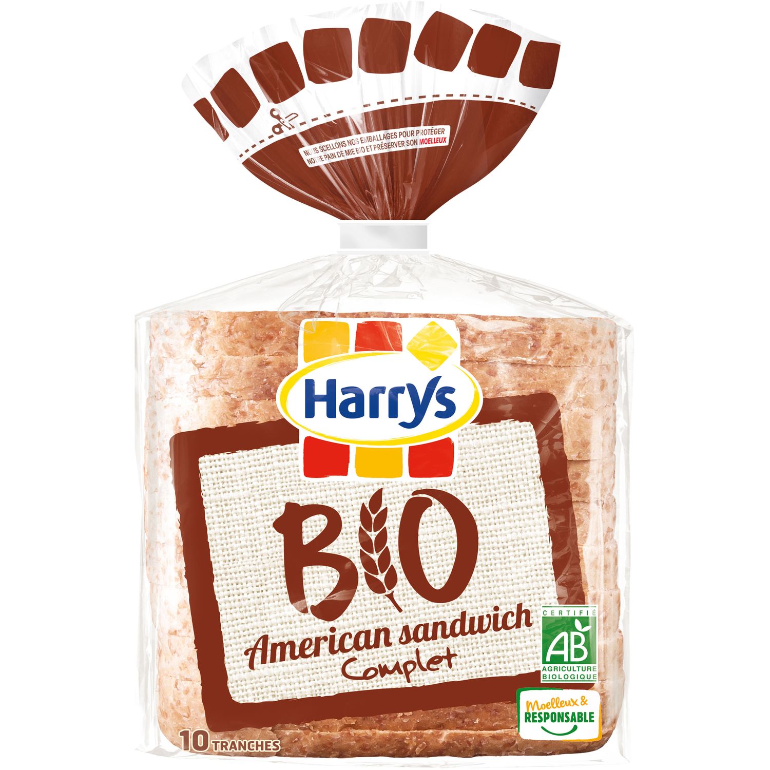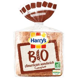 PAIN DE MIE COMPLET BIO Redécouvrez l’American Sandwich Complet, désormais en version BIO ! Une recette riche en fibres et à la farine complète de blé, certifiée BIO, qui garantit la qualité et le moelleux inimitable d’Harrys. De la première à la dernière tranche, une mie aérée et délicieuse qui rendra votre quotidien extraordinaire. Les grandes tranches moelleuses et généreuses de l’American Sandwich Complet BIO sont idéales pour le petit déjeuner et le goûter, mais aussi pour confectionner vos sandwichs, tartines ou croque-monsieurs, à midi ou le soir selon vos envies.
