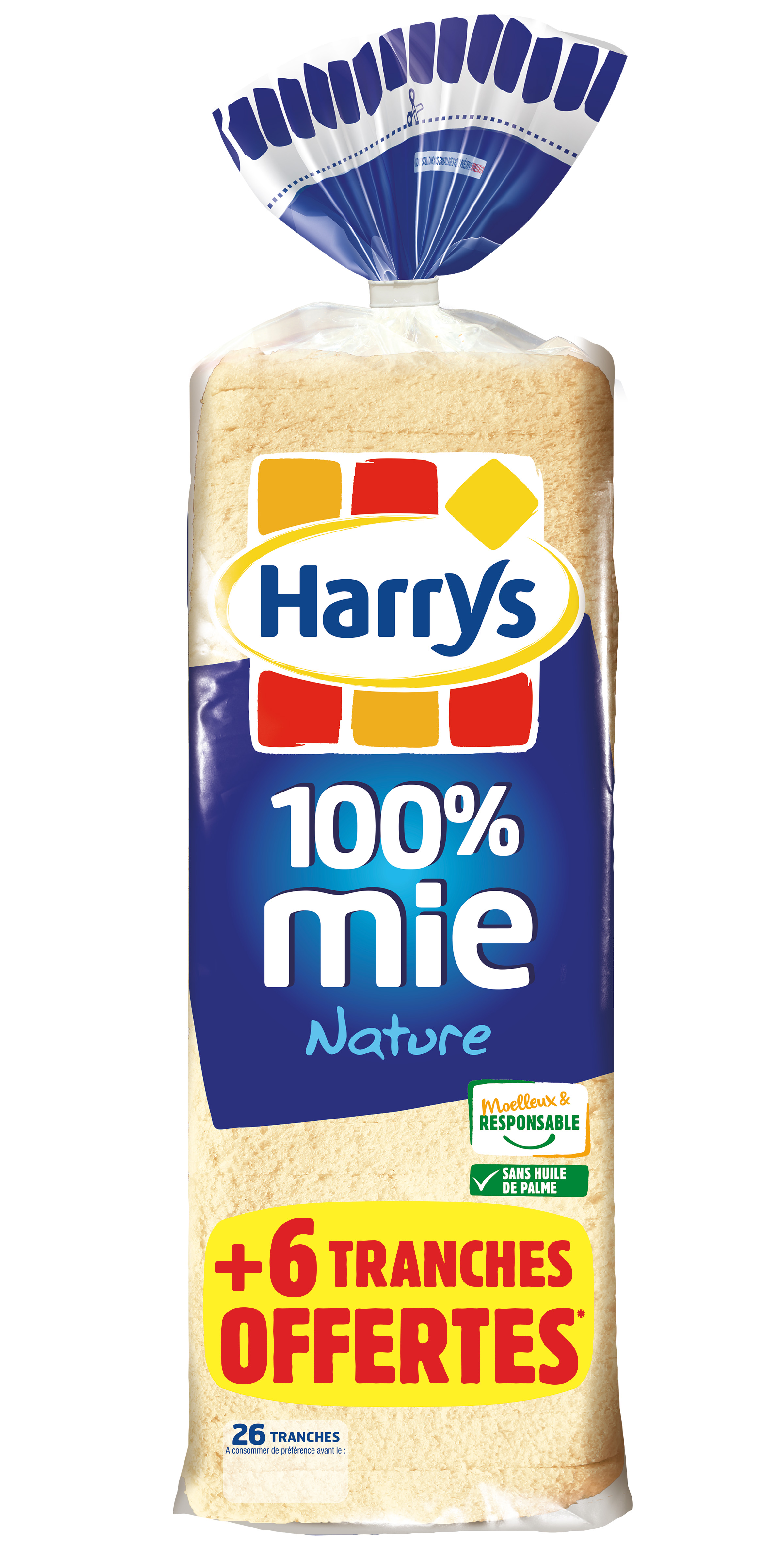 100% Mie : Pour tous ceux qui n’aiment pas la croûte de pain ! Harrys a créé en 2004 en France le premier pain de mie sans croûte, pour un moelleux sans limite* ! 100% Mie existe en de nombreuses recettes pour satisfaire les envies de chacun. Pourquoi c’est bon ? Parce que 100% Mie nature plaît à tous et allie : • La douceur et le moelleux inimitables de Harrys • La simplicité d’un pain de mie nature • Une recette sans huile de palme et bien sûr sans croûte À déguster nature ou toasté pour accompagner un petit déjeuner équilibré ! C'est aussi le pain de mie idéal pour la réalisation de sandwichs savoureux. *dans le cadre d’une alimentation variée et équilibrée et d’un mode de vie sain.