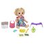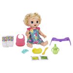 Cette grande poupée aux cheveux blonds adore manger. Et tel un vrai bébé, elle ouvre la bouche lorsqu'on approche la cuillère pour la nourrir ou lui donne le biberon. Elle mange vraiment de la nourriture si bien qu'il faut changer sa couche lorsqu'elle est pleine.