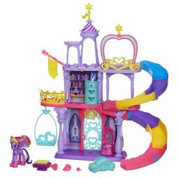 Château Arc-en-ciel de Twilight Sparkle de chez Hasbro, un immense château rempli de secrets à découvrir grâce à la clé magique ! Comme dans le dessin animé, Twilight Sparkle va y vivre de nombreuses aventures magiques : elle découvre les trésors que cachent sa garde robe, son vanity, son livre, sa commode et la porte du château… grâce à la clé magique, elle emprunte le toboggan avec son nuage volant, elle profite ensuite de la balancelle pour approfondir la magie avec son livre, et enfin, elle se prépare pour le bal du Château dans sa suite princière Magique !