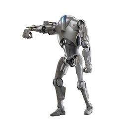 Découvrez la figurine de collection Super Battle Droid de la marque Hasbro, issue de la franchise Star Wars. Cette figurine en plastique robuste mesure 15 cm de hauteur et présente une finition gris métallique. Elle possède plusieurs points d'articulation permettant de recréer des scènes emblématiqu