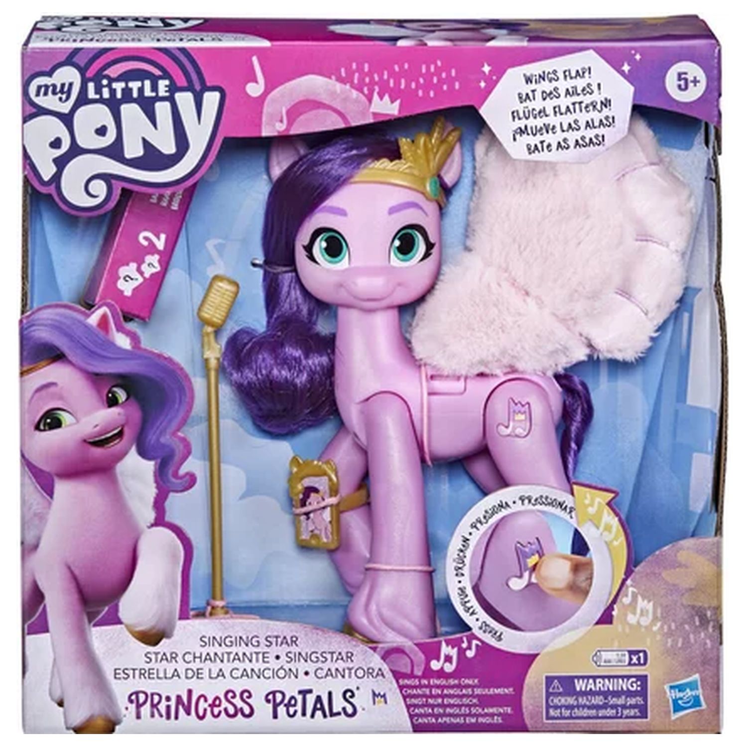 On apprend à connaître Princess Petals, une pégase de Hauts-de-Zéphyr ! Princess Petals est une star de la pop talentueuse et élégante. On imaginera que cette figurine Princess Petals Star musicale monte sur scène au gala royal, inspirée du film My Little Pony: A New Generation. Inclut un poney rose Princess Petals de 15 cm avec une note de musique inspirée du personnage en guise de marque de beauté sur un de ses flancs. La crinière violette de la figurine articulée est bouclée dans son style emblématique. La figurine émet aussi de la musique et bouge ! Quand on appuie sur sa marque de beauté, on l'entend fredonner une partie de sa chanson « Glowing Up ». On appuie sur ses pattes arrière pour lui faire battre des ailes. On l'imaginera voler tout en donnant un spectacle pour ses fans. Inclut 5 accessoires pour que les enfants la prépare à entrer en scène