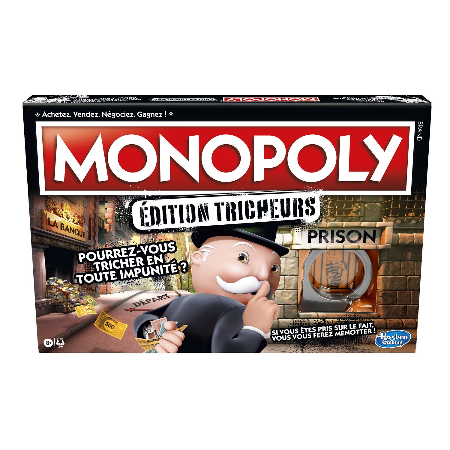 Monopoly permet désormais de modifier les règles, d'emprunter de l'argent et même de conclure de drôles d'affaires. Ainsi, les joueurs pourraient trafiquer un lancer de dé, voler de l'argent à la banque et omettre de payer un loyer. Chaque tricherie accomplie est récompensée, mais chaque échec sera puni. De plus, cette édition n'inclut que des hôtels, il n'y a donc aucune maison. Finalement, un bracelet de menotte pour « enchaîner » les joueurs au plateau a aussi été ajouté pour créer d'autres moments amusants. Ce jeu pourrait bien devenir le chouchou des soirées de jeux ou de tout autre rassemblement festif ! Les noms et logos Hasbro Gaming, le logo Parker Brothers et le logo Monopoly et tous les autres titres, logos, personnages, les quatre coins du plateau, le nom MR. MONOPOLY, ainsi que chacun des éléments distinctifs du plateau et les pions de jeu, sont des marques commerciales d’Hasbro pour son jeu des transactions immobilières et son équipement de jeu.