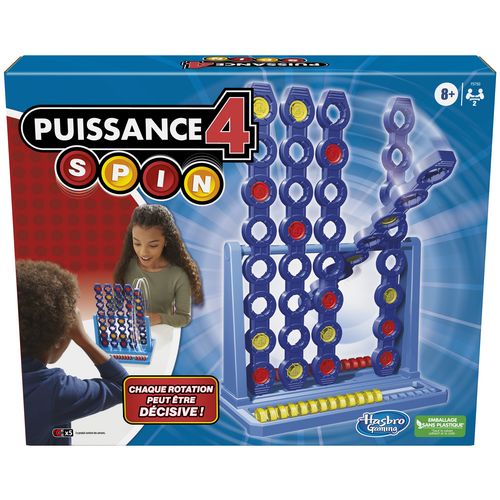 C'est un jeu stratégique de poids et d'équilibre où chaque tour de la grille peut changer le cours de la partie. Les joueurs choisissent l'endroit où ils placent leur pion dans la grille, puis ils font tourner la colonne. Ils doivent aligner 4 pions horizontalement, verticalement ou diagonalement pour gagner. Mais ils doivent bien observer l'emplacement des pions de l'adversaire avant de faire tourner, sinon ils pourraient lui donner la victoire. Chaque couleur dispose d'un pion lesté pouvant changer la donne en un instant. Avec ses deux modes de jeu (Débutant et Expert), le jeu Puissance 4 Spin est parfait pour jouer en famille ou entre amis (à partir de 8 ans). Hasbro Gaming et toutes les marques et logos associés sont des marques de commerce de Hasbro, Inc.