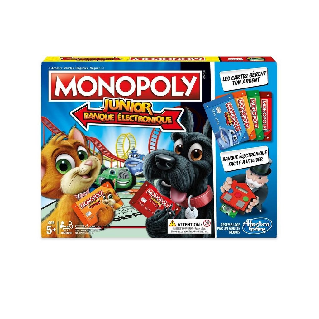 Joue comme un grand avec le Monopoly Junior électronique. La carte bancaire remplace les billets. Gagne le plus d'argent possible mais attention aux faillites !
