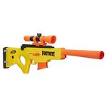 Ce blaster est composé d'un mécanisme de chargement à ressort sur le côté, d'un canon allongé et d'une lunette de visée pour remporter la Mega Battle Royale de Fortnite. Il suffit d'insérer le chargeur dans le blaster, de déplacer la poignée d'amorçage vers l'arrière puis vers l'avant et d'appuyer sur la détente pour tirer une fléchette.