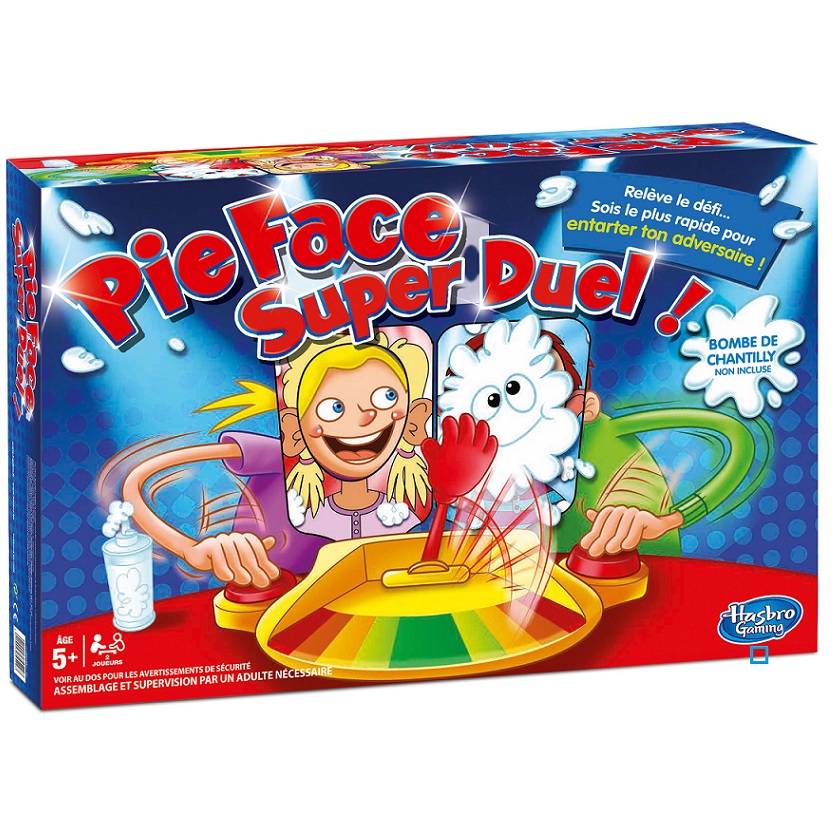 Avec Pie Face super duel, sois le plus rapide pour entarter ton adversaire ! Le principe est simple, enduis la main mécanique de crème chantilly, appuie sur le bouton le plus rapidement possible, si tu es plus rapide que ton adversaire il se fera entarter, sinon... C'est toi qui va goûter la crème !