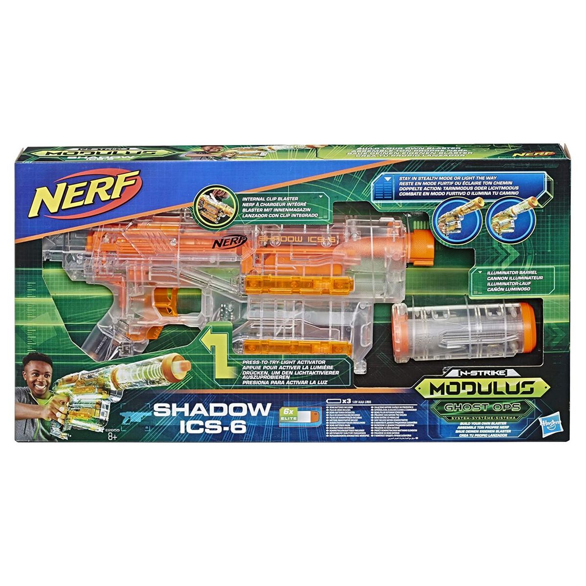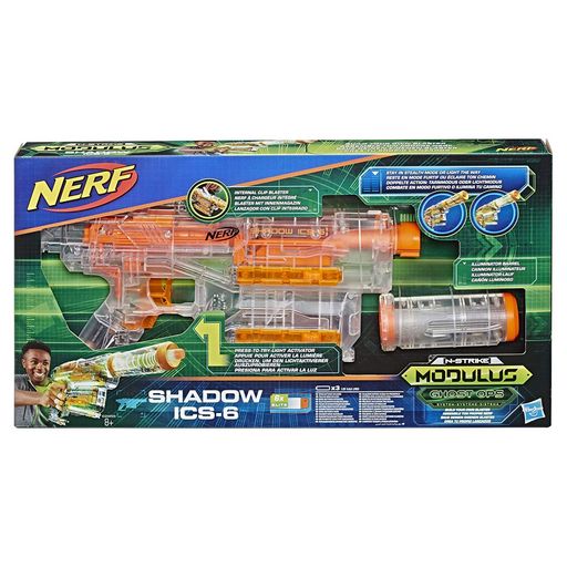 Restez en mode furtif ou éclairez le chemin avec le blaster Ghost Ops Shadow ICS-6 ! Ce blaster Nerf Modulus possède un boîtier transparent qui s'illumine lorsque l'on appuie sur la gâchette de lumière. Gardez le blaster en mode clair pendant les actions furtives pour ne pas être détecté. Illuminez le blaster pour vous guider dans les missions à faible luminosité !