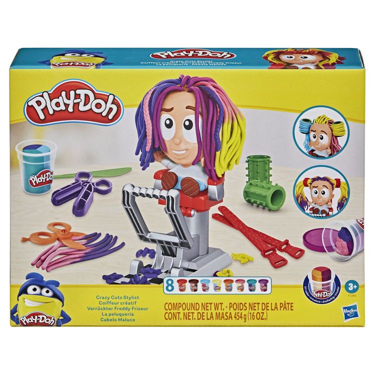 Des cheveux PLAY-DOH infiniment longs, plus on ajoute de pâte à modeler Play-Doh dans le mécanisme, plus les cheveux Play-Doh de la figurine poussent. Bien coiffé ou complètement rasé, on peut couper les cheveux avec les ciseaux Play-Doh ou les raser avec le rasoir factice. Ensuite, on a qu'à refaire pousser les cheveux Play-Doh et à recommencer. Laissez parler votre créativité avec l'outil à crêper, le rouleau à tresses, les bigoudis et les attaches. Inclus 8 pots de PLAY-DOH : 3 couleurs pour plus de variété.