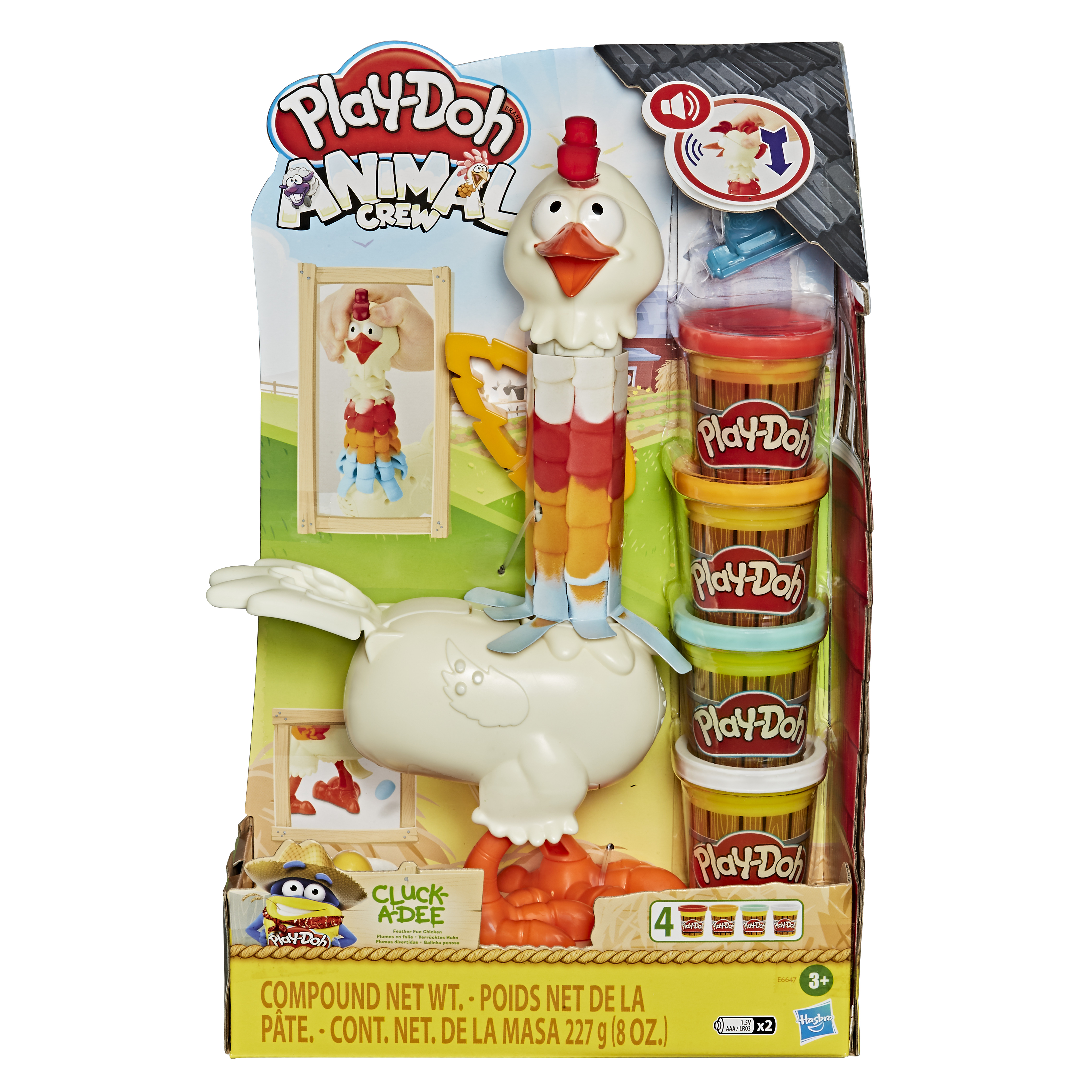 Fais pousser les plumes de la poule sur son cou et sa tête ! Et pour faire rire les plus petits, la poule caquette ! Voici Cluck-a-Dee, la poule pondeuse. Amuse-toi à lui faire pousser des plumes Play-Doh, pour cela remplis le cou du poulet avec de la pâte Play-Doh, puis d'appuyer sur sa tête pour v
