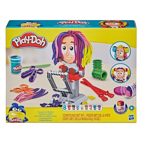 - 1 personnage, 3 différentes têtes, 1 siège de coiffeur, 8 pots de pâte à modeler Play Doh tricolore de 56g (soit 454g au total), 2 bigoudis pour onduler les cheveux, 1 fer pour gaufrer les cheveux, 1 rouleau pour créer des tresses, 1 paire de ciseaux pour couper les cheveux, 1 rasoir , 2 élastiques pour inventer des coupes uniques, 1 dernier outil pour peaufiner votre création.