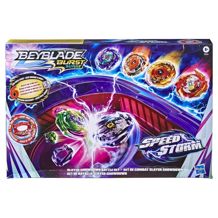 On dynamise la stratégie de combat avec la technologie Beyblade Burst Surge Speedstorm ! On lance sa toupie dans un face à face à grande vitesse dans l'arène Beystadium Beyblade Burst Surge Speedstorm Slayer Showdown.
