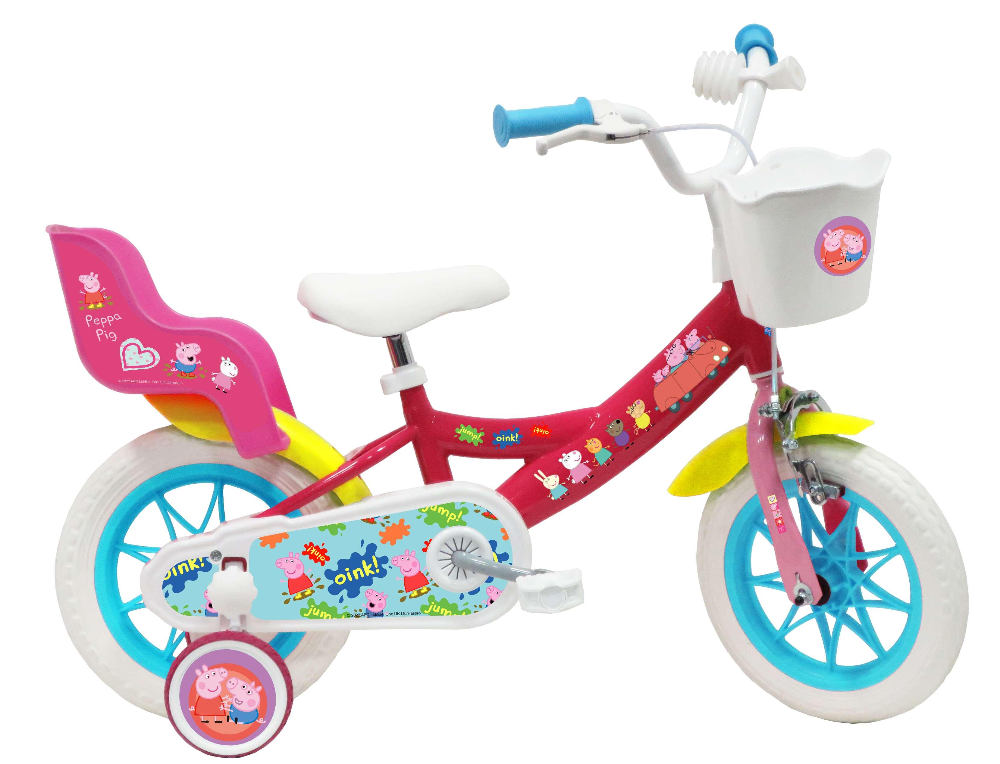 Vélo enfant 12'' - Modèle Peppa Pig pour enfant de taille 85 à 100 cm avec stabilisateurs - 1 Frein - Panier avant - Porte poupée arrière et roues bâtons