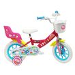 Vélo 12 Fille Licence Pepa Pig pour enfant de 85/100 cm - Cadre Acier - Direction et pédalier en nylon -Transmission monovitesse - Pignon fixe - Frein avant Calliper - Carter de chaîne intégral - Gardes boue et poignées spécifiques pour augmenter la protection de l'enfant - Pneus EVA - Stabilisateurs (montage sans outil) - Avertisseur sonore - Panier avant - Porte-poupée