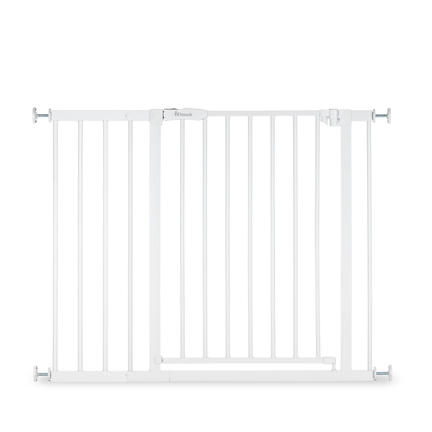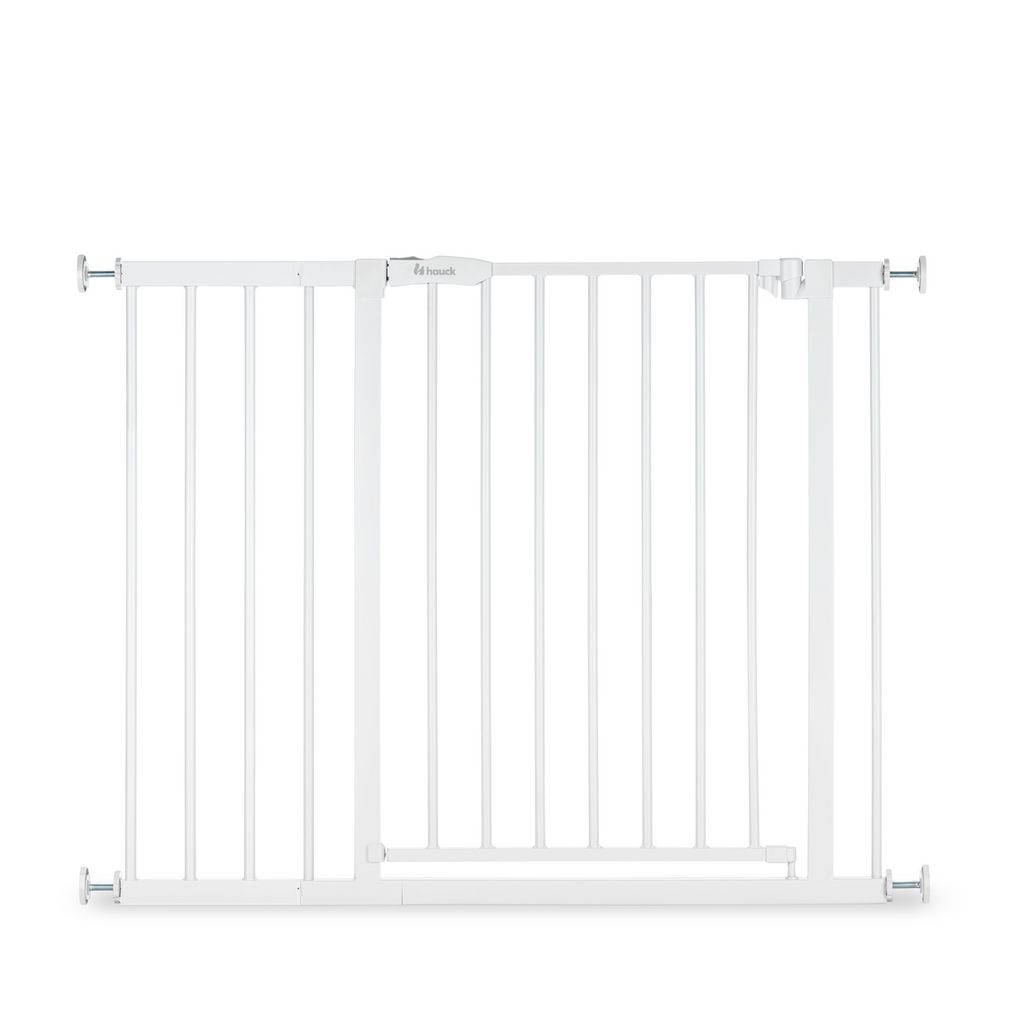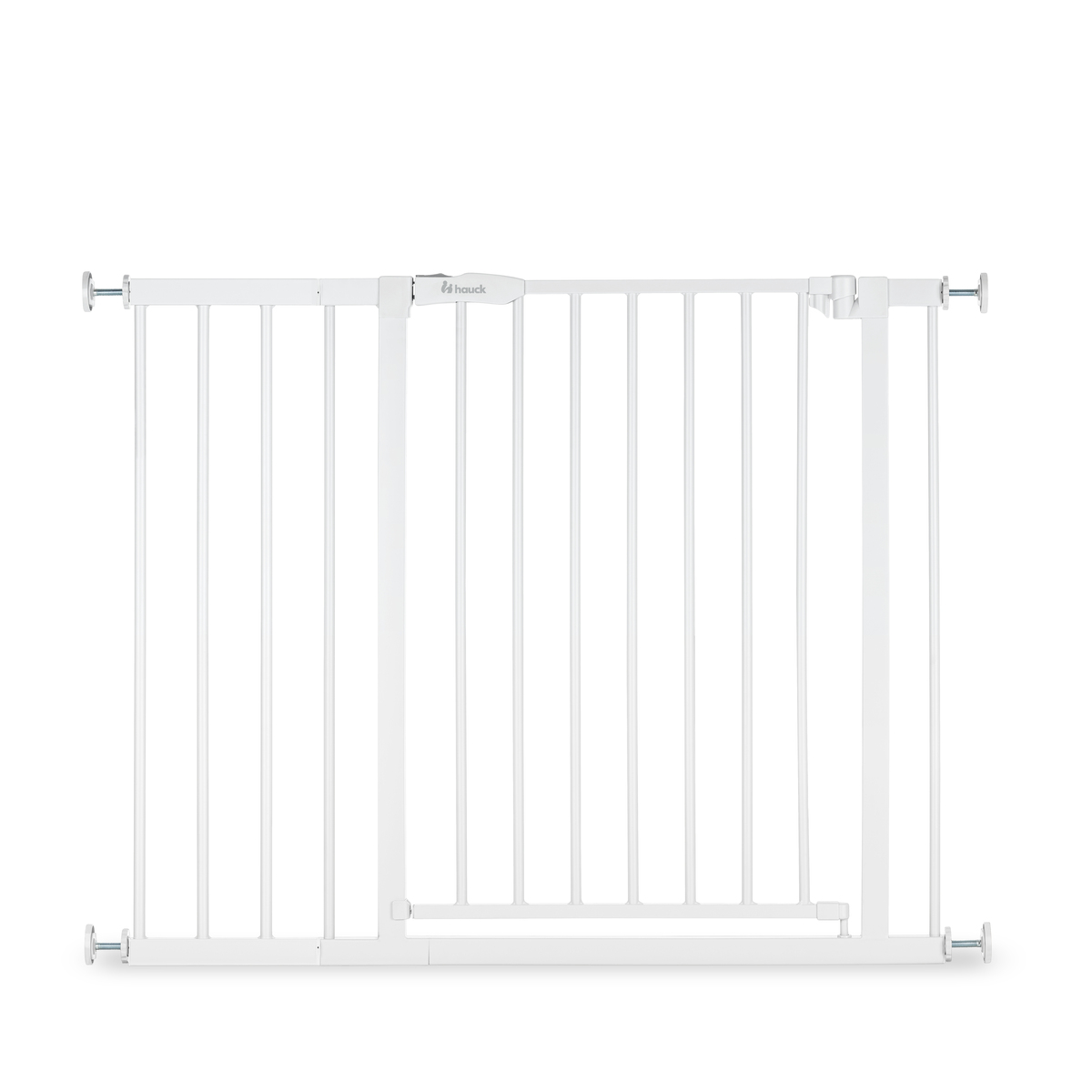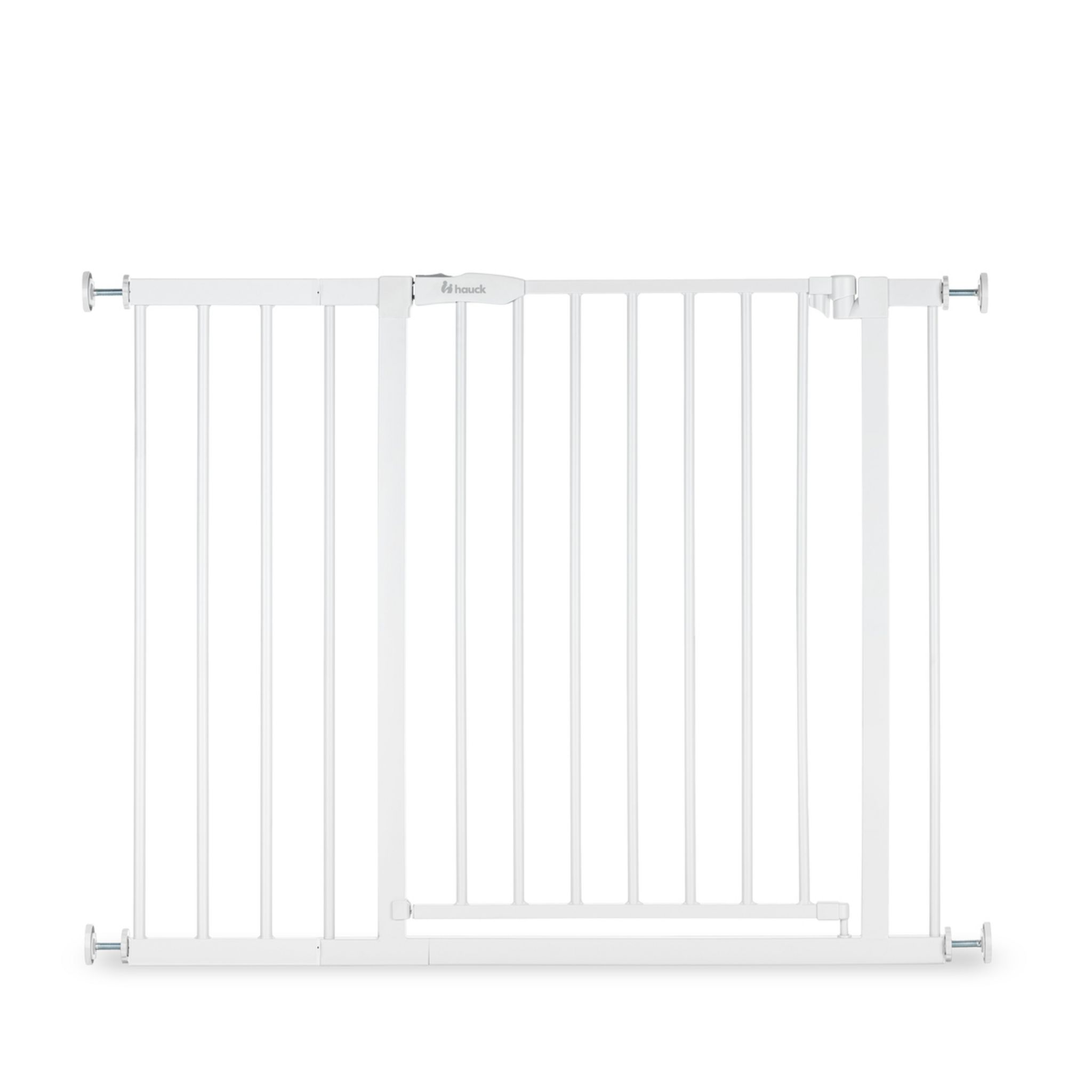 OPEN N STOP 2 SET +21 CM Dès que votre enfant est mobile, il devient essentiel d'utiliser des barrières de sécurité sur les escaliers et les portes. L'ensemble pratique Open N Stop 2 vous offre une sécurité et il est en même temps facile à utiliser. La barrière de sécurité pour enfants avec son extension de 21 cm, convient aux portes et aux escaliers d'une largeur comprise entre 96 et 101 cm. Ensemble de barrières de sécurité pratiques à fermeture manuelle pour les portes et les escaliers Dès que votre enfant est mobile, il devient essentiel d'utiliser des barrières de sécurité sur les escaliers et les portes pour protéger votre petit. Que ce soit à la maison, chez les grands-parents ou en vacances, la barrière se fixe de manière stable avec des vis de réglage à fixation par pression et elle se retire sans laisser de résidus. La barrière de sécurité s'ouvre d'une seule main des deux côtés et se ferme facilement. L'ensemble Open N Stop 2 avec son extension de 21 cm, ne convient pas seulement aux passages d'une largeur comprise entre 96 et 101 cm, mais il peut également être étendu jusqu'à 122 cm grâce aux extensions de 9 cm et 21 cm disponibles séparément. Avec des broches en Y Hauck séparées, la barrière de sécurité peut également être montée sur des escaliers avec des montants ronds. Les dimensions suivantes sont possibles avec des extensions séparées : 75 à 80 cm = barrière pour enfants sans extension 84 à 89 cm = barrière pour enfants + extension de 9 cm 93 à 98 cm = barrière pour enfants + extensions de 9 cm et 9 cm 96 à 101 cm = barrière pour enfants + extension de 21 cm 105 à 110 cm = barrière pour enfants + extensions de 9 cm et 21 cm 117 à 122 cm = barrière pour enfants + extensions de 21 cm et 21 cm Remarque : cette barrière de protection est auto-ajustable. Cela signifie que l'inclinaison initiale/l'écart dans la zone du mécanisme de fermeture est supprimé en serrant les quatre vis de fixation.