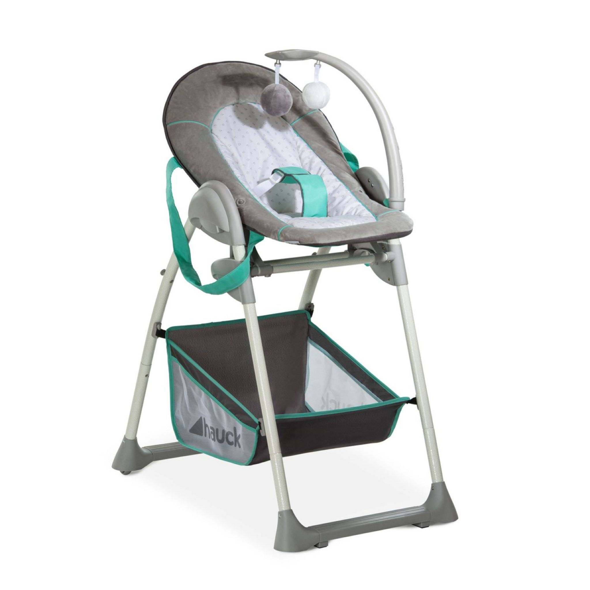 Vous pouvez ranger les jouets et autres accessoires dans le grand panier. En cas de besoin, déplacez la Sit'n Relax grâce aux deux roulettes ou la plier."