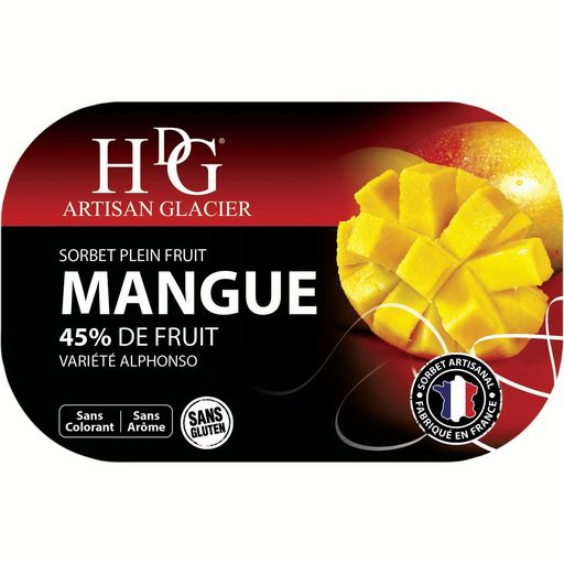Ce sorbet artisanal est fabriqué dans la région Rhône-Alpes. Il est confectionné sans colorant ni arôme, à partir de mangue variété Alphonso (45% de fruit).