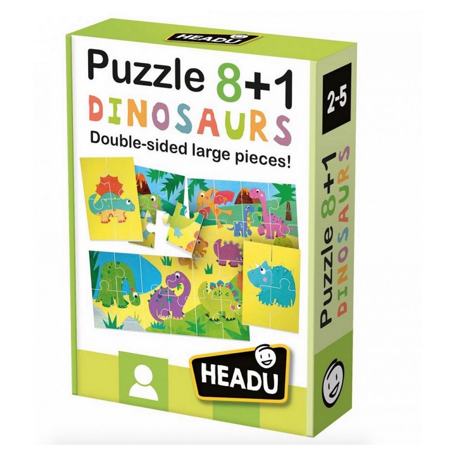 De grandes pièces double-face très résistantes pour jouer et faire de nombreuses découvertes. D'un côté, l'enfant assemble 8 dinosaures amusants et de l'autre une magnifique scène préhistorique.