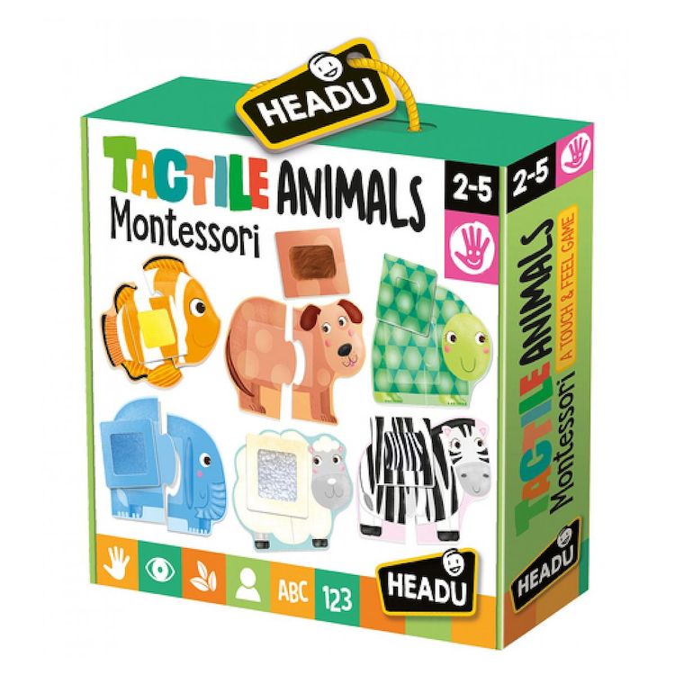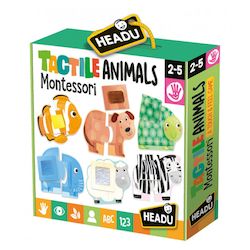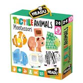 Encastre, assemble, touche et apprends !. Après avoir assemblé 6 grands puzzles, l'enfant exerce sa perception sensorielle en cherchant les pièces tactiles qui correspondent chacune à un animal différent.