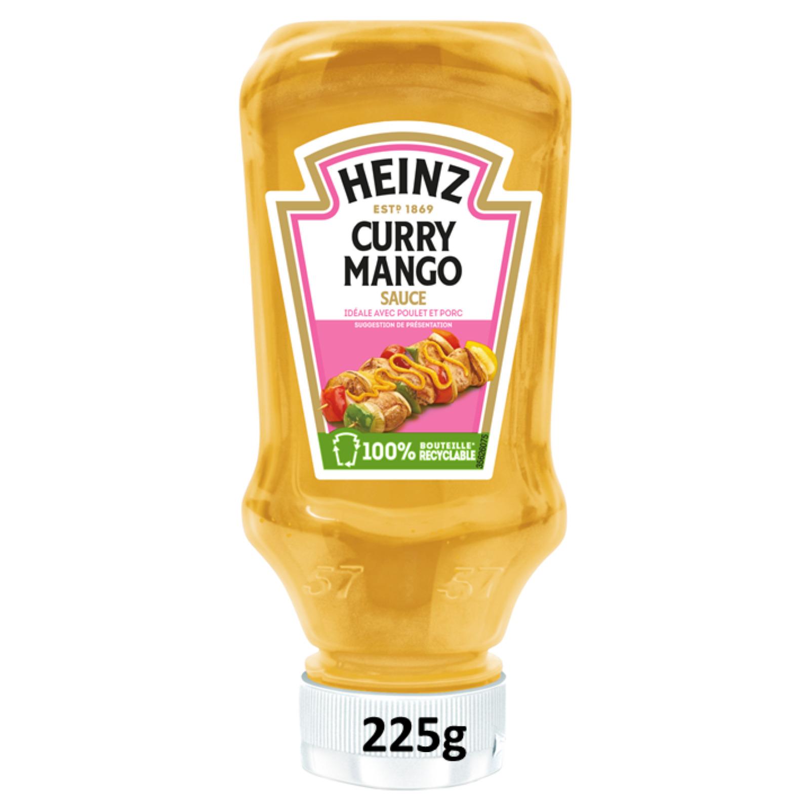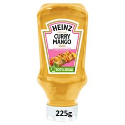 Ingrédients: Eau, huile de tournesol, vinaigre d'alcool, sucre, purée de mangue 3,6%, amidon modifié, curry en poudre 2%, sel, jaune d'œuf, épices (contiennent moutarde, céleri), colorant (caroténoïdes), acidifiant (acide citrique), épaississant (gomme xanthane), herbes, extrait d'épice.