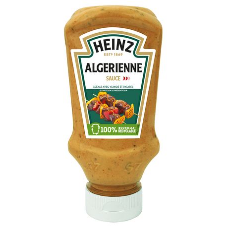Découvrez la sauce Algérienne Heinz. Une sauce variété épicée au chili et aux oignons. Idéal pour accompagner des viandes, brochettes, kebab et falafels. Notre sauce Algérienne est un incontournable du fast food! La subtile combinaison de piments, d'épices, de tomates et d'oignons lui donne un goût unique et fera des merveilles en accompagnement. Pour un maximum de praticité, découvrez cette bouteille souple "tête en bas" équipée d'un bouchon à valve en silicone. Pour une sauce toujours prête à être dégustée, un dosage facile et un bouchon toujours propre après usage. Cette sauce est disponible en flacon souple au format 220g.